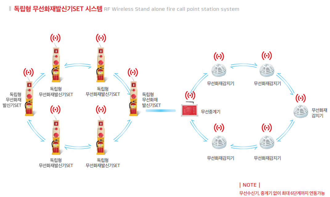 즉, 화재시 하나의 발신기가 동작을 하면 설치된 모든 발신기의 사이렌이 동시에 알람이 되어 설치장소 전체에 대한 동시 경보가 가능하며, 무선발신기의 예비전원 시스템은 피난유도선과 연동되어 정전시 최대 100M까지 비상전원을 공급하여 안전한 피난시스템을 제공한다.